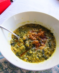 So after a few goes at making dahl from different recipes, and falling head-over-heels in love with it, one Sunday I prepared for a very intensive week of editing by making a giant pot of spinach dahl. Flavour-wise, I find it improves more with each day (even up to four or five days in). It has the comfort-food factor to boot: soft in the mouth, and deeply nourishing to the body and soul. I have eaten this dahl every day for lunch for almost a week, and not tired of it one little bit.