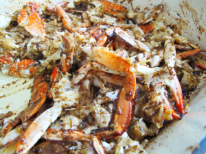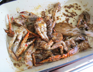 Suffice it to say that if you want to make this soup, you must prepare for a splatter fest, given that the smash-up here involves not only crab but a soupy mix of roasted capsicum and onion and tomatoes. I started out trying to prevent crab on the ceiling by leaning over the pan and hoping my apron would take the brunt, but eventually I just gave in and bashed away with the rolling pin, picking bits of crab and roasted capsicum and tomato off the walls and my face as I went, pitching the bits back into the pan as best I could. I even confess to a certain amount of pleasurable abandonment to the process after a while.