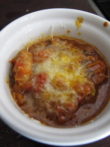 I ended up cooking it for a bit over an hour to get this texture, which was almost right I think. I wonder though if another 10 or 15 minutes might have made it just a tiny bit softer and more pleasing. I tossed a few big spoonsful into a ramekin, topped it with parmesan cheese and bunged it under the grill for a few minutes., as suggested by Stephanie.