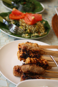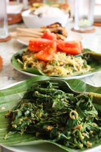 The most time-consuming part is the spice paste, a version of which seems to be used for almost everything Balinese, or at least everything I made that night (fish sticks, roast chicken in banana leaves, as well as the lawar, along with some stirfried kangkung and some bumbu- the lemongrass & chilli sambal Komang served with every meal). But after the paste is made, the lawar is really just a matter of a quick cook, squidge and mix. So my plan for next time is to make a giant batch of the spice paste and keep it in portions in the freezer, just as I do with chermoula, and then whack this dish together for a quick midweek burst of Bali whenever I get homesick for the sound of gamelan and the scent of tuberoses.