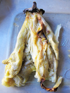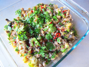 I used two medium eggplants which were heavier than 220g each by a long way, and I used double the pork mince because that’s the amount I had in the freezer (from Feather & Bone, natch, so it was deeeeeliciously full of free-range fat and flavour), and I used only half the chilli because we are wimps, but otherwise the sauce quantities stayed the same. Oh and I used a bit of leek because I didn’t have any green onion. Despite all this bastardisation it was unbelievably good.