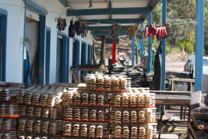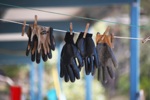 On the drive home we stopped in to buy oysters from a row of sheds on the foreshores of Pambula Lake. The sun was out that day, and the waters were still and blue, and the surrounding bush rang with cicada song. But when I look back at the photographs I took that day I am most touched not by those glistening blues and greens, but by the images of work: the slanting, casual symmetry of the layered oyster racks and trays; the muddy tide mark on a flat-bottomed tinny; the pairs of faded red and grey work gloves pegged to a line beneath the corrugated awning of the sheds. These are pictures of the dignity of labour, and – like Robinson’s brick wall in sunlight – to me they are moving, and vital.