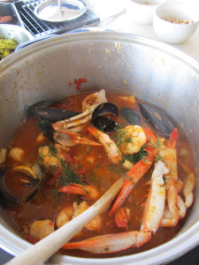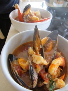 Sunday lunch in winter is a very fine thing, and a big pot of shellfish stew has gotta be up there as one of the easiest ways to make it happen. I don’t think I’ve ever made a proper bouillabaisse according to a recipe, but over the years various versions of this fishy number have made their way to our table.