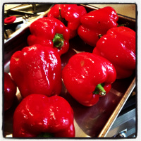 Suffice it to say that if you want to make this soup, you must prepare for a splatter fest, given that the smash-up here involves not only crab but a soupy mix of roasted capsicum and onion and tomatoes. I started out trying to prevent crab on the ceiling by leaning over the pan and hoping my apron would take the brunt, but eventually I just gave in and bashed away with the rolling pin, picking bits of crab and roasted capsicum and tomato off the walls and my face as I went, pitching the bits back into the pan as best I could. I even confess to a certain amount of pleasurable abandonment to the process after a while.